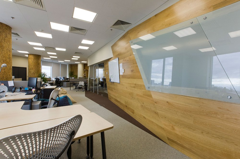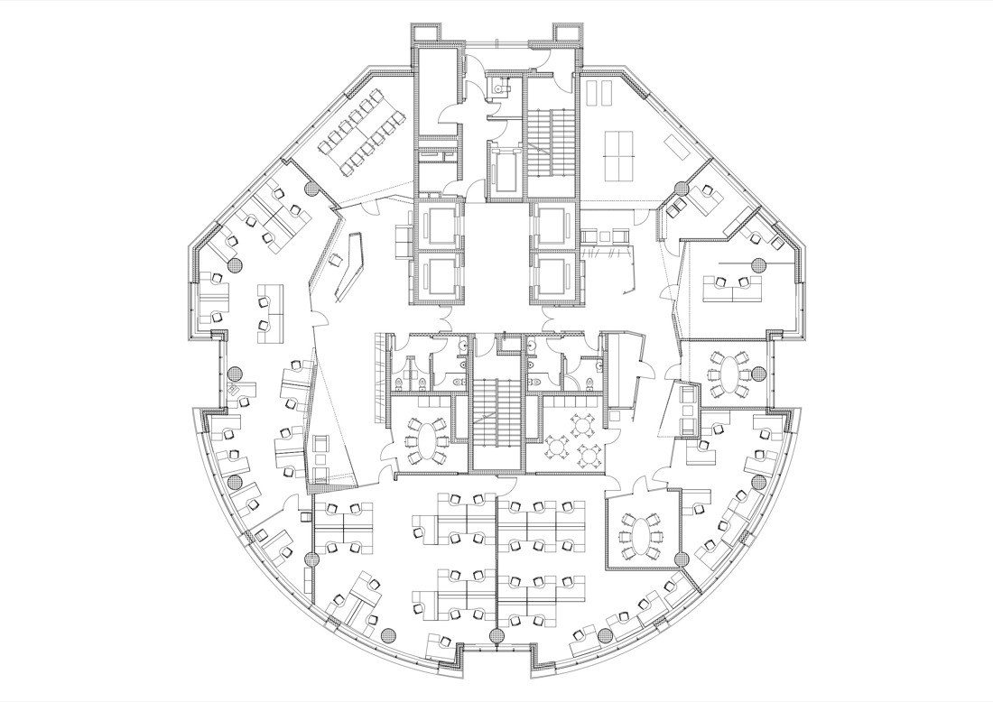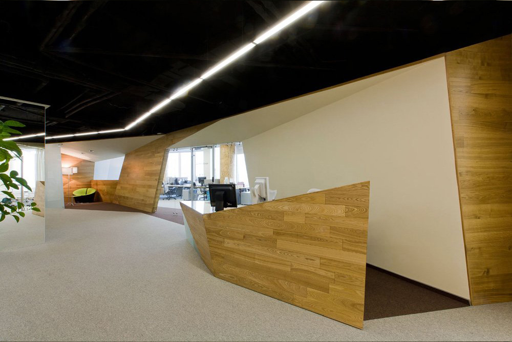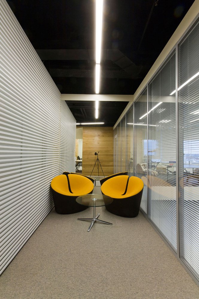 該場地呈方正矩形,因此設計圍繞中心使用功能而布局。首先必要的功能是衛生設施,然后是其它必備的空間比如廚房與咖啡間,這些功能空間都有對水的需求。布局上,設計師保留了建筑原有的框架,不同的房間沿著走廊串了起來,透明的玻璃內墻使整個空間變得柔和,橙色涂料的使用則為黑白灰的整體風格增添了一絲明快。走廊頂面從視覺上比實際層高要高些,工作區吊頂采用影院級的吸音材料,以減低環境噪音。互聯網線以及電線管道隱藏于架空地面,上面覆以地毯,這樣便于網絡的接口。雖然平面呈矩形,但在立面的處理上采用動態的斜面,以此豐富空間形態。