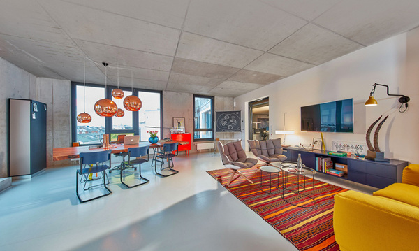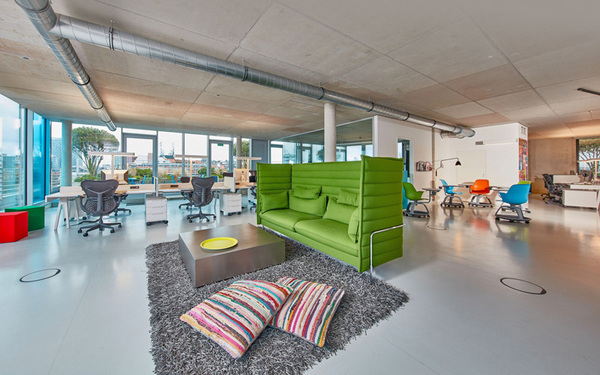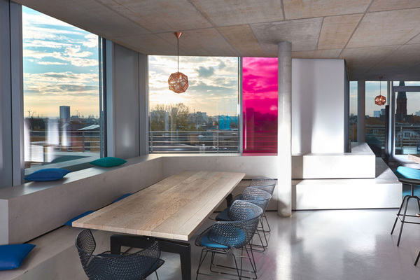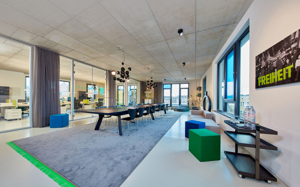 freiheit公司的文化精神通過室內的裝飾材料和形式得以表達。組織團隊的開放辦公區裝點以超大型的木制工作臺;這里配有生活廚房、大禮堂以及亮麗的創客空間,隨手涂寫的黑板墻、大型木制工作臺、甚至還有壁爐,公司的程序員都在這個頂層空間共同辦公、合作與休閑交流。