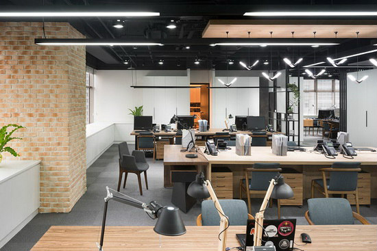 3、現代時尚的主題辦公室設計案例:以現代時尚的主題表達團隊形象,透過空間的通盤整合,延伸辦公場域的使用尺度,也讓行走動線更流暢。空間中運用溫暖的元素,如文化石與天然木質等,細膩營造場域內的質樸與舒適感。設計師以整排矮柜的方式保留對外采光,兼具收納機能與對外的流通性。