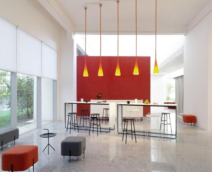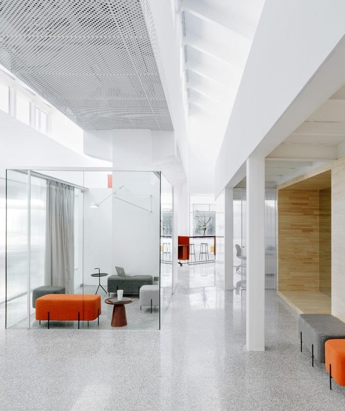 某創意園區辦公室裝修茶水間設計:將茶水間放置在兩翼的樞軸上意圖在于是其成為辦公室的社交中心,同時可以通過全玻璃立面欣賞到花園景觀。茶水間的前面有一個服務區,儲藏食品的同時設置了服務器室、門衛室、浴室、淋浴間和洗滌區。辦公室的設計爭取較大化每個部門的利益: 例如會計和管理或許會需要一個非常私人的辦公室,又或常互動和溝通的部門需要一個開放的空間配置。紅色密度板圍合出來的盒子隱藏著兩個CEO的辦公室,他們可以享受大棚子的自然光和全高窗戶的花園景觀。