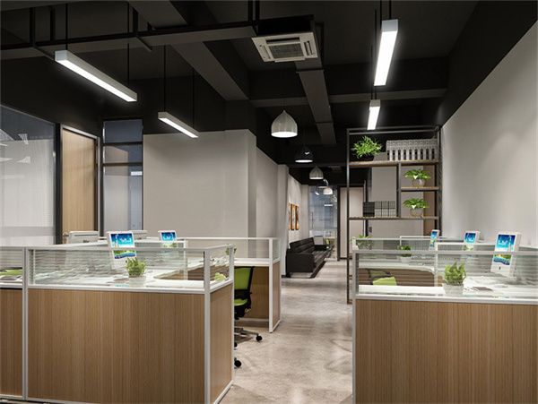 2、該創意園辦公室裝修案例主要以簡約工業化風格主,設計師運用光線的原理大面積使用玻璃隔斷,天花噴黑 地面油加固漆,使其整個辦公室更加通透、大氣且提高員工的舒適感。