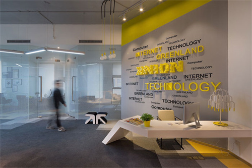 1、600平方互聯網公司辦公室前臺設計的時候,由于空間自身具有其優點——頂相對高,設計師希望可以將這個優點聚焦加以放大,設計師將前臺設計成類似弧形的四分之二圓,同時放低其高度,讓墻壁可以完后自己的使命——形象墻,讓前臺空間的屬性可以在此基礎上承擔更多的責任。