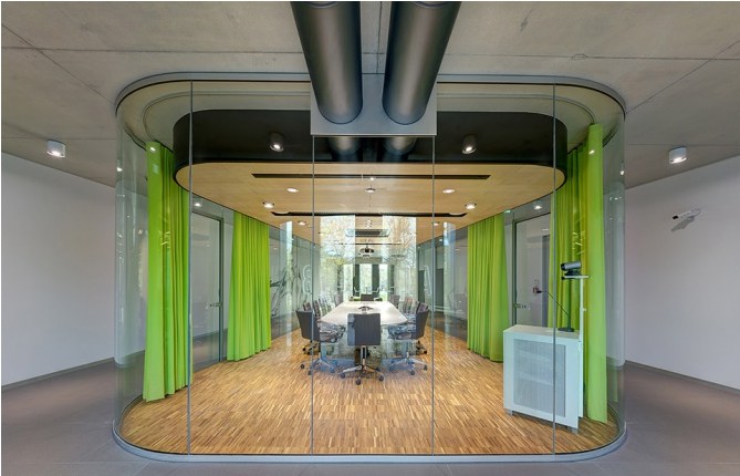辦公室設計效果圖,室內設計上,建筑師放棄了吊頂,將混凝土天花板直接暴露。室內辦公區采用了大面積的玻璃窗,不僅光線明亮,也與室外發生更緊密的聯系。部分空間為了防止過熱以及過多陽光射入,配備了不妨礙用戶欣賞室外風景的百葉窗。