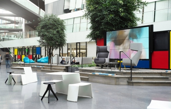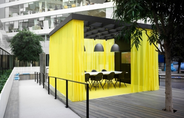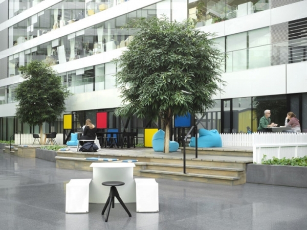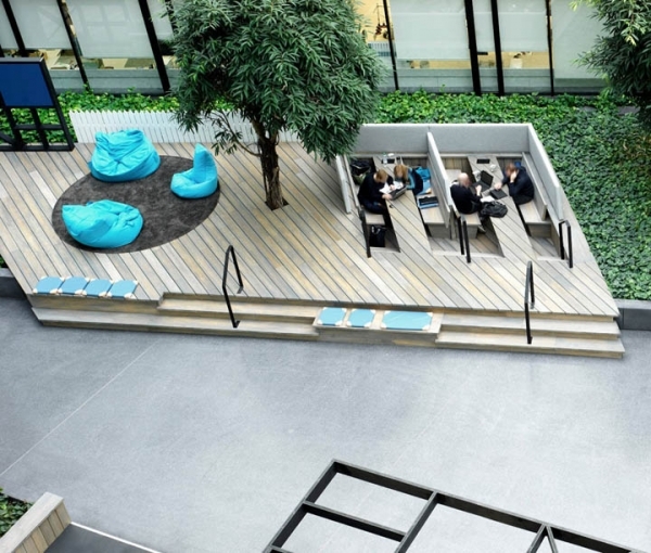 中庭空間通過自然溫馨的材質、完全開敞的布局、以及充滿情感的人文設計,讓這處空間與理性的建筑構造呈現出強烈的視覺反差,加入了時尚潮流的辦公設計元素讓這里華麗蛻變。