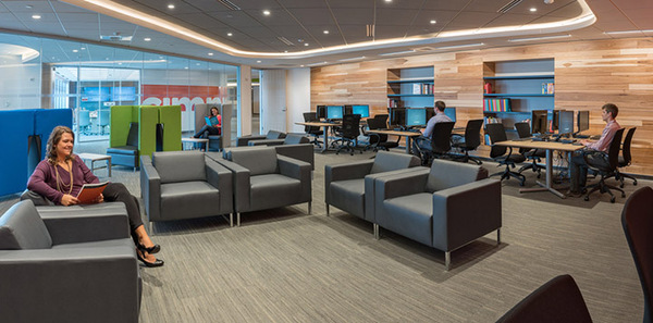 除了協(xié)作空間,設(shè)計(jì)團(tuán)隊(duì)還設(shè)計(jì)了一處閱覽空間,給團(tuán)隊(duì)成員提供一處寧靜的工作區(qū)。為了解決開放式空間所帶來的聲學(xué)問題,設(shè)計(jì)采取多種措施確保聲音的隱私性,以及視聽會(huì)議室和人多的房間的隔音性能。