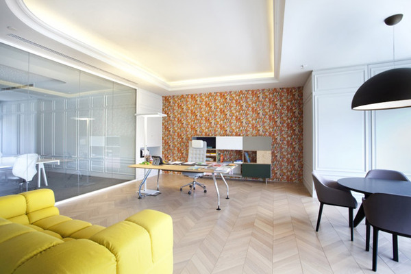洽談室的設(shè)計(jì),設(shè)計(jì)師采用了白色、灰色、黃色、黑色顏色之間的轉(zhuǎn)換,來體現(xiàn)洽談室的價值,人體對顏色很敏感,多種顏色經(jīng)過設(shè)計(jì)師的重新搭配,更顯得時尚、創(chuàng)新。