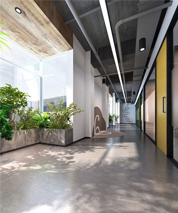 過道區域的設計:設計師在設計的時候,以點綴為主要設計目的,硬裝之余以綠植做為主要的點綴飾物,將自然很好的引入室內。