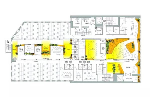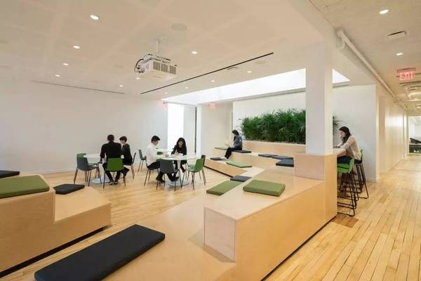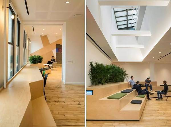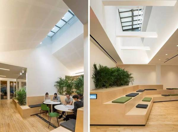 Sn?hetta對Slack新紐約空間設計的靈感來源于**特色的城市小院。從Paley Park的室內景觀中吸取靈感,竹植物提供自然的隱私屏幕,并為綠化帶來空間。現有四個天窗與放大,八字天花板大大增加了室內以及內部小庭院的自然光線。