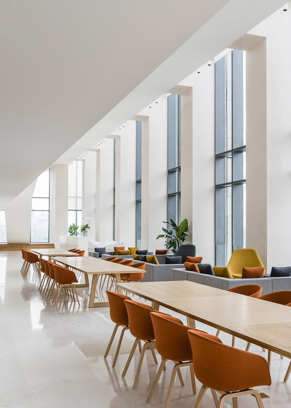 每天,人們都會在辦公室中呆很久,所以設(shè)計師希望創(chuàng)造一個舒適而又智慧的場所。設(shè)計師為天花上的燈加上了一層反射膜,這樣整個天花都能發(fā)出柔和的漫反射光。這是一個充滿創(chuàng)新而又微妙的設(shè)計,連接室內(nèi)外。諸如用戶自己設(shè)計的地毯和藝術(shù)品這類的細節(jié),也顯示出外灘SOHO的空間精神,同時也給這個開放大空間以豪華而又親密之感。
