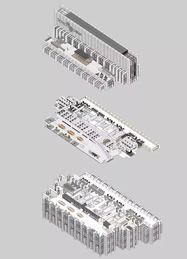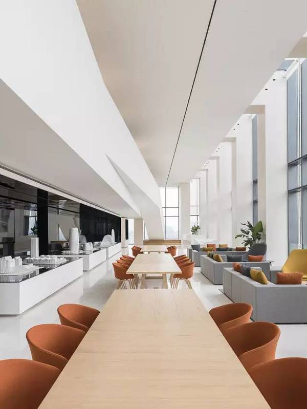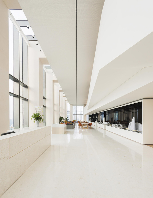 室內(nèi)和室外同時使用了簡化的米黃色的石材,作為對于外灘老上海建筑的一種追溯,還使用仿佛能把人帶入未來的簡潔而堅硬的白色墻面。此外還有許多的小細節(jié):電梯廳附近45度的傾角;奶油色的石材使得空間看上去更加開闊;明亮的光照,在上海的古老和現(xiàn)代之間尋找到平衡。