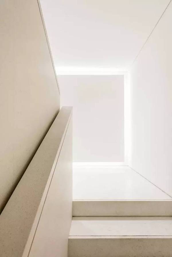 外部空間把閣樓包裹起來,創(chuàng)造出可以看到外灘和浦東壯觀城市景象和綠意的視角。提醒我們即使身處鬧市,依舊可以擁有一方寧靜與安祥。從室內(nèi)巨大的窗戶看出去,樓梯間平臺與窗外的城市保持了一致的頻率。光線也可以創(chuàng)造和分割空間。