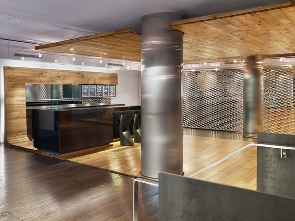 不同于其他各種材質(zhì)、各種類(lèi)型的屏風(fēng)和隔斷,設(shè)計(jì)師選用鋁網(wǎng)篩孔這一特殊的建筑材料將吧臺(tái)與開(kāi)放式工作區(qū)巧妙分隔。