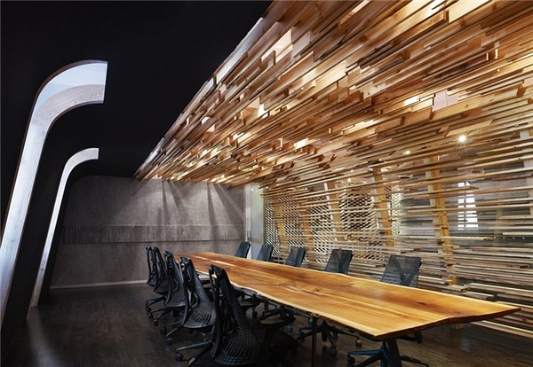 會(huì)議室的照明也經(jīng)過(guò)深思熟慮,燈具隱于頂面條板的上方,形成豐富的光影效果。由完整的櫻桃樹(shù)打磨而成的會(huì)議桌,呈現(xiàn)著木紋自然的曲線(xiàn)、訴說(shuō)著不菲的價(jià)值。獨(dú)立辦公室沿外墻而設(shè),家具都采用橡木特別定制。