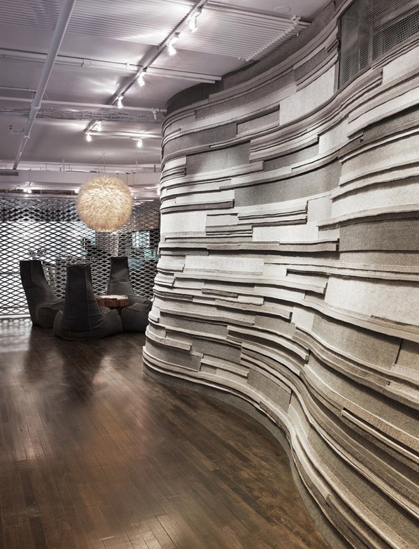 設(shè)計(jì)圍繞四個(gè)空間主題:休閑吧、線(xiàn)形開(kāi)放式辦公位、羊毛氈飾面的空間結(jié)構(gòu)體、以及大會(huì)議室。場(chǎng)所不僅適用于辦公需求,還兼有多重功能,如舉辦各種派對(duì)、發(fā)布會(huì)、開(kāi)幕式、以及招待會(huì)等,因此休閑吧成為空間的重中之重。