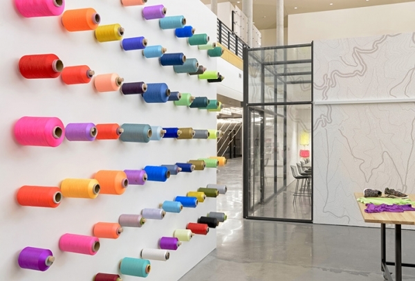 因為是運動服飾研發(fā)公司,因此類似面料、橡膠、紗線、還有鞋子等物品即需要儲存的地方,也要便于隨時觀摩。儲物柜是一種解決方案,但O+A提出更好的創(chuàng)新方案。當(dāng)設(shè)計團隊在現(xiàn)場考察的時候被儲物盒中靚麗的紗線色彩所吸引。一個個漂亮的線軸被精心裝飾于墻面上,形成一道裝置藝術(shù)墻。