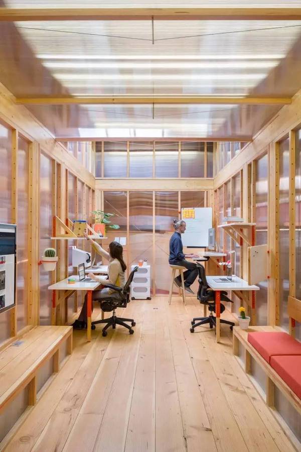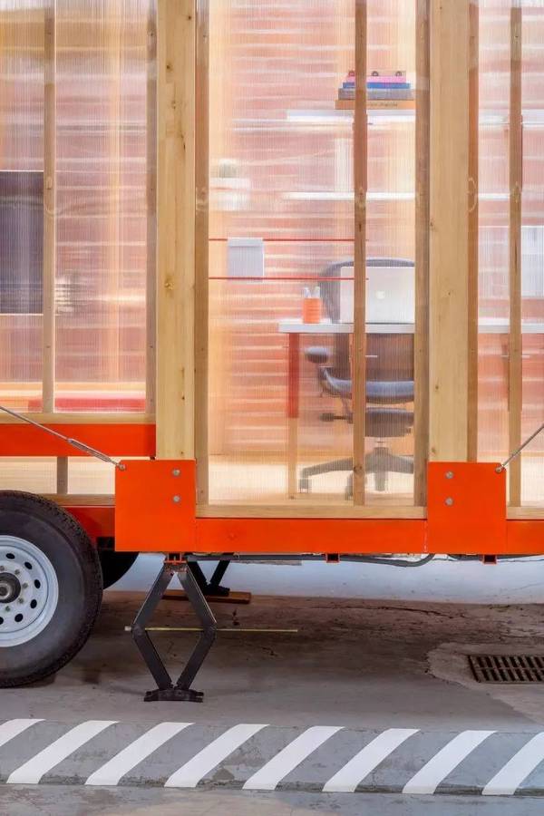 設(shè)計(jì)師保留了拖車的后梁結(jié)構(gòu),使用聚碳酸酯面板作為整個(gè)辦公室的墻壁。這種材質(zhì)的面板允許大量光線填充空間,同時(shí)也能吸收一些自然光,使得室內(nèi)光線不那么刺眼。設(shè)計(jì)師用從本地采購的道格拉斯冷杉木來與半透明的墻壁搭配。 此外,他們還大膽的采用紅色以及其它鮮艷的顏色來活躍氣氛。