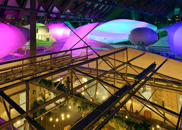 整個展區的中心的辦公室設計被一個巨型白色雕塑占據,這個裝置本身也成為展覽的一條主要游覽路徑,可以連接到展區的各個位置。進入夜晚后,在夜景主題的燈飾光照環境下,白色雕塑還會顯出漸變的彩色紋理,頗有些童話世界的味道。如果這樣的辦公室風格設計出現在你的工作環境中,會不會樂不思家呢?