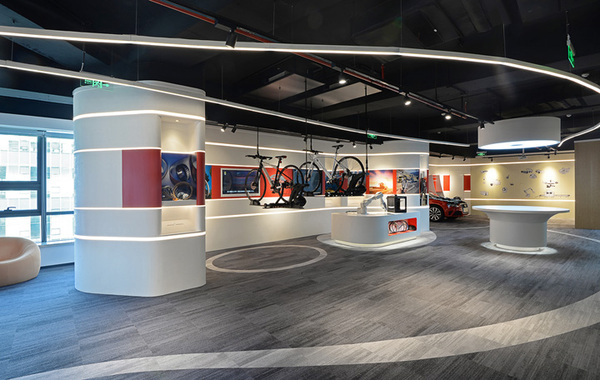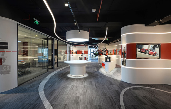 上海領企創裝飾公司分享的這套網絡科技辦公室裝修設計圖中,辦公室前臺及展廳的設計采用了弧形墻體,墻體上的弧形燈帶、天花上的吊燈以及不同顏色地毯拼接而產生曲線元素貫穿整個展廳空間,帶來極強的視覺延伸感。配合了VR等互動體驗裝置,以及實體產品,為訪客帶來富有科技感的體驗感受。提高空間的功能性和使用效率,大會議室可以在需要的時候由移動隔斷分割為兩個獨立的會議室使用。下面領企設計創裝飾公司小編帶大家看一下1200科技公司辦公室裝修案例!