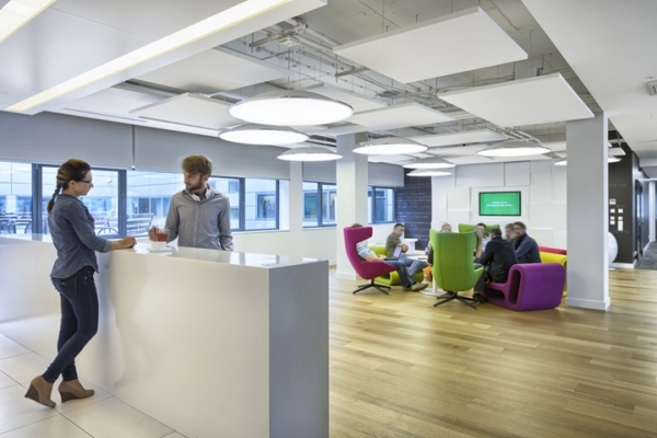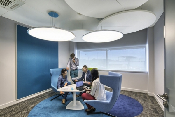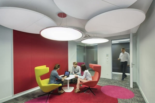 多彩的協(xié)作空間,圓形的頂與圓形的燈上下交錯構筑了一個動感有趣的視覺空間,并與地面圓形的地毯形成形式上的呼應;而墻面局部點綴的色彩也與彩色地毯相映成趣。流暢的圓弧造型和曲面高靠背椅帶來柔和優(yōu)雅的工作氛圍。