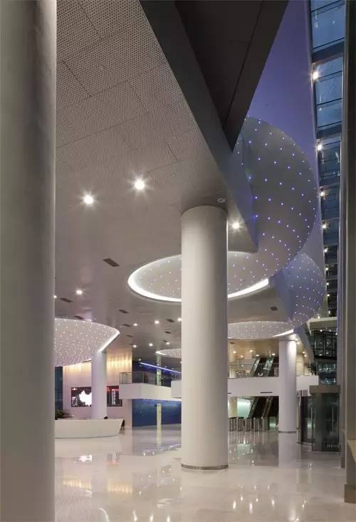 運用現代簡潔的設計手法,高雅明快的色調,精致和諧的材料,設計師成功營造出一個純粹干凈的國際化企業空間氛圍。中性高雅的色調成為空間的背景,而一些高科技的設備及材料:比如激光投射燈、穿孔金屬板的運用,則表現出信息時代敏銳、高速的特色。通過合理組織參觀流線,有效串聯功能空間,設計強化了室內環境與內院環境、室外環境的聯系與互動,做到空間次序明確同時各部門又各具特色。建筑良好的視線及引入建筑的陽光、綠化,則充分與小型討論區、會議單元、咖啡區休息區結合起來,使辦公環境輕松化、特色化、人性化。