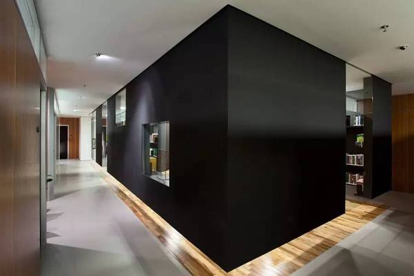 這是為律師事務所設計的室內空間,空間包含兩層,有著清晰的格局:一層較大,負責公司運行,另一層則較小,負責會議和管理。一旦這兩層被明確地分為功能層和公共活動層,設計想要展示公司理念的任務就落在了第一層上。鑒于此,設計呈現出放射式的空間分布方式,每個會議室都位于邊緣地帶,有室外的景色和自然照明,而被環繞在中心的是一個巨大的圖書室,它組織通向各個房間的流通系統。