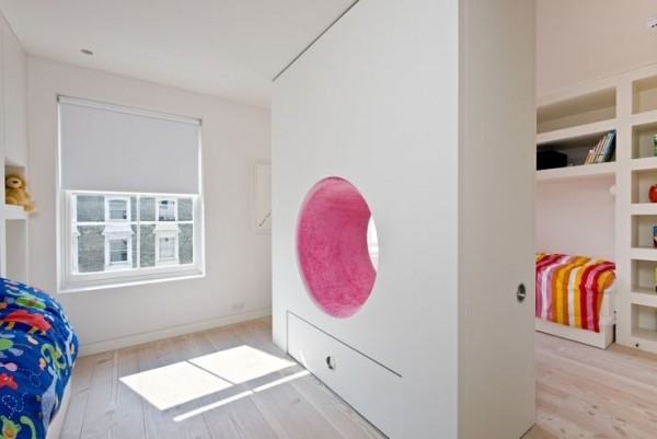 上面的是收納柜,也是隔斷,它們共處一室。粉紅色隧道,避免了厚重的墻壁帶來的壓抑感給空間創造更多的樂趣。