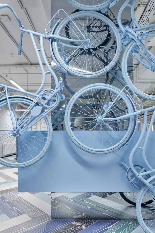 這種梯級的色彩配比猶如美麗的風景畫一般令人賞心悅目,也再次點明本案的設計主題:運動、青春、以及浪漫主義的藝術情懷。接待臺旁邊那一組粉藍色自行車藝術裝置再次強化了這個設計主題。接待區的多元混搭組合設計,也在向大家傳遞這是一個多功能綜合型的辦公室屬性。