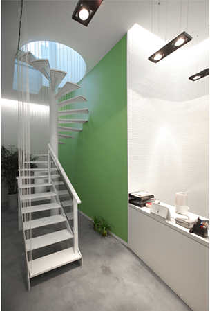 裝修的色彩并不是多種顏色搭配呈繽紛靚麗的景象,而是簡(jiǎn)單的青綠色為主題,經(jīng)典黑白色輔助映襯。綠色的裝修裝飾給人青春活力的感覺(jué),用在這里再合適不過(guò)了。其次是樓梯的造型設(shè)計(jì),圓形旋轉(zhuǎn)樓梯,造型上的別致同樣也帶來(lái)了異樣的體驗(yàn)。