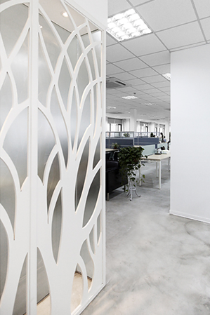 辦公室裝修的屏風(fēng)設(shè)計(jì)不僅僅是處于玄關(guān)的作用而設(shè)置,也有著很大的裝飾作用。鏤空的樹(shù)形結(jié)構(gòu)造型設(shè)計(jì),一層模糊的鋼化玻璃,隔絕視線(xiàn)的同時(shí),也營(yíng)造了一個(gè)朦朧而富有趣味性的室內(nèi)空間。