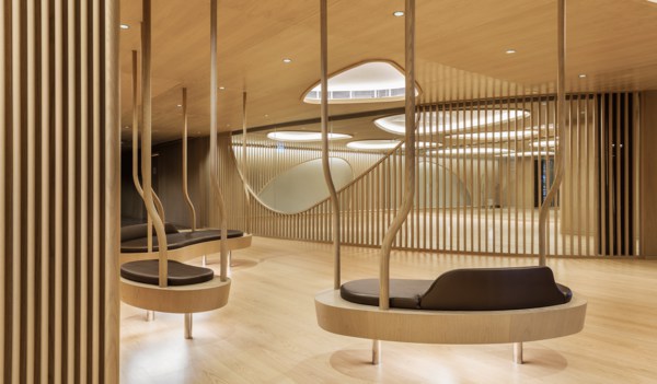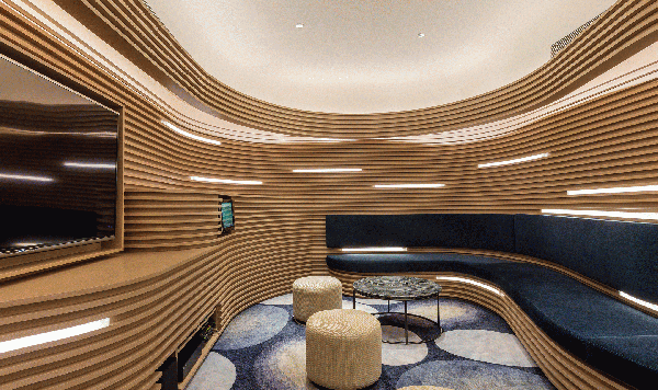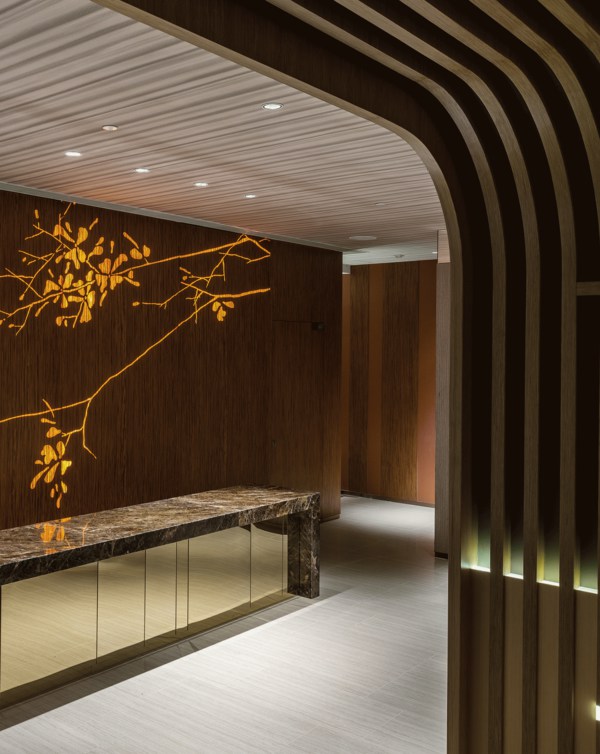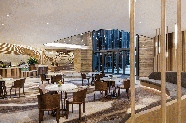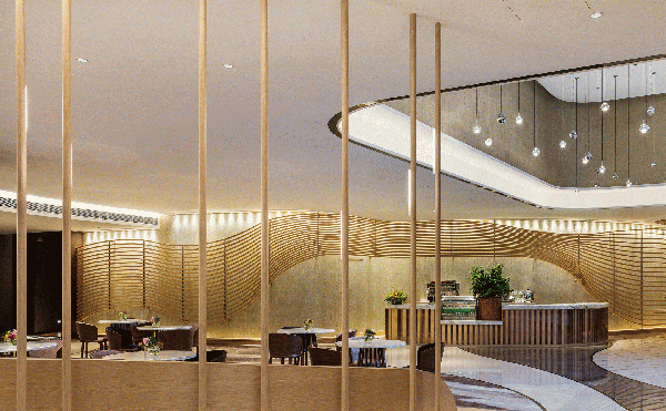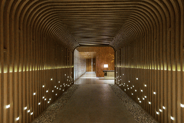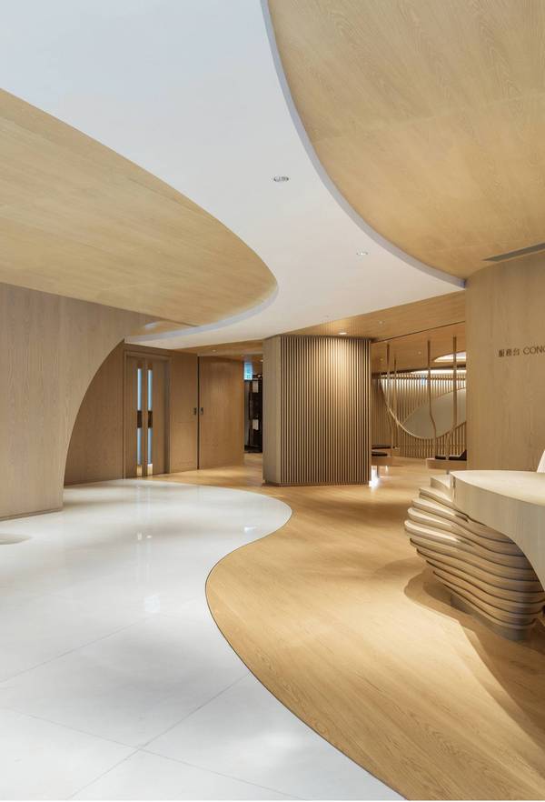 會所內(nèi)的木材不僅僅是結(jié)構(gòu)性的支持,起伏有致的輪廓劃分出不同區(qū)域,優(yōu)雅的弧線跨越寬敞的空間與柔和的燈光產(chǎn)生巧妙的相互作用。豐富的線條增強空間的立體感而不失悠閑的舒適享受,精妙的雕塑元素糅合簡約的燈光折射及滲光燈槽,整體干凈利落,構(gòu)筑出精美雅意而富藝術感的視覺效果,凸顯設計師細膩的設計考量。