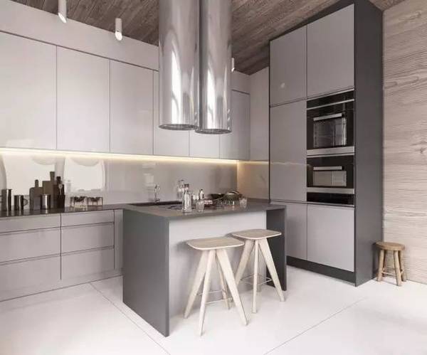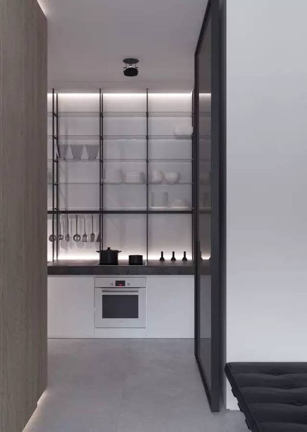 簡潔利落的廚房,表面沒有多余的裝飾,但金屬感的設計酷勁兒十足,在材質的沖撞中凸顯質感。