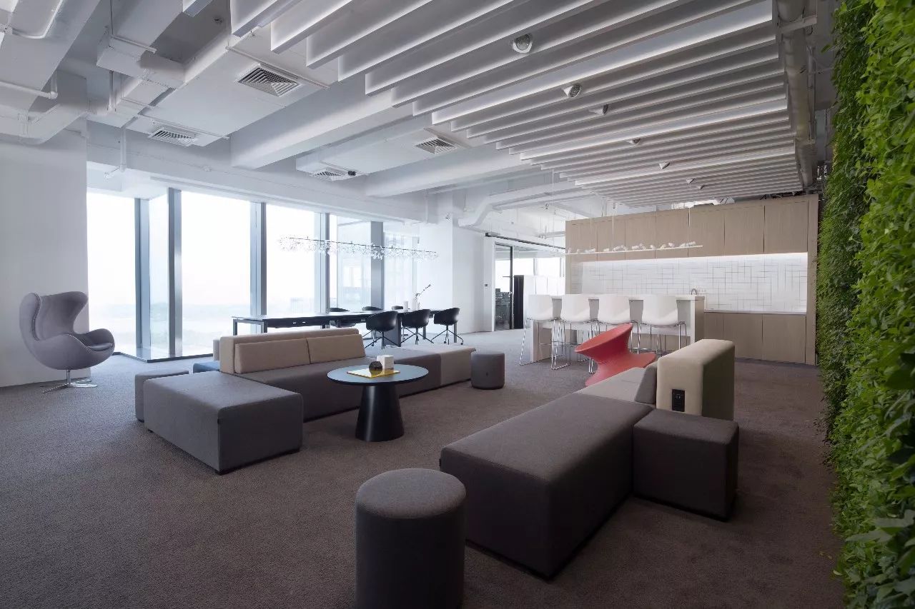 為了弱化傳統辦公室的緊張氛圍,公共休閑區配置了特別大的面積,包括大面積的垂直綠化墻、廚房及水吧。成為員工聚會、休息,或工作交流、頭腦風暴的聚集地。模塊化的沙發,能實現多變的組合方式,以及滿足員工360度全方位的無障礙溝通。
