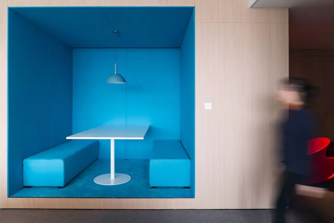 每個單獨的盒子,被賦予簡單純粹的色彩和材質,比如包裹墻面和天花的彩色吸音毛氈,有效降低與其他區域的相互干擾,實現**的聲學效果。人在里面活動時,空間和人的關系,以及人與人的關系變得更緊密而有趣,同時獲得一種沉浸式的空間體驗,使討論或工作變的更放松和專注。