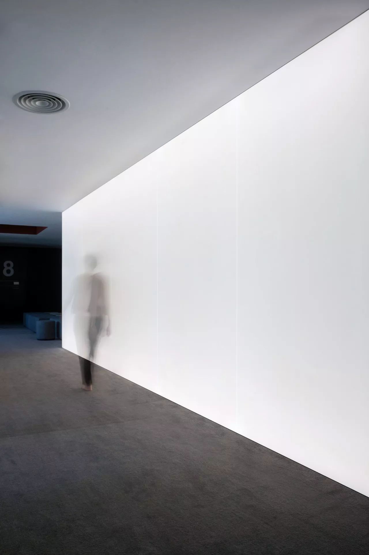 會務中心層的發光玻璃墻,滿足了整個空間的照明,同時又成為空間的視覺核心,營造出純粹、安靜、脫俗的藝術辦公空間氛圍。