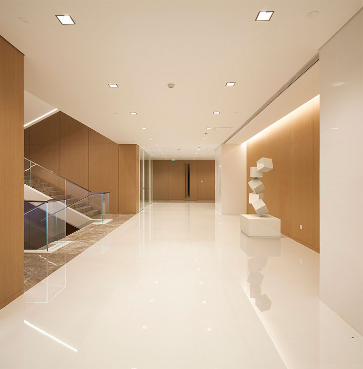 與樓梯遙相呼應的是中庭的高管會議休閑區(qū)。配合迷你花壇營造有機簡約但**氣勢的空間。藝術(shù)吊燈為空間增加了韻律與活力。