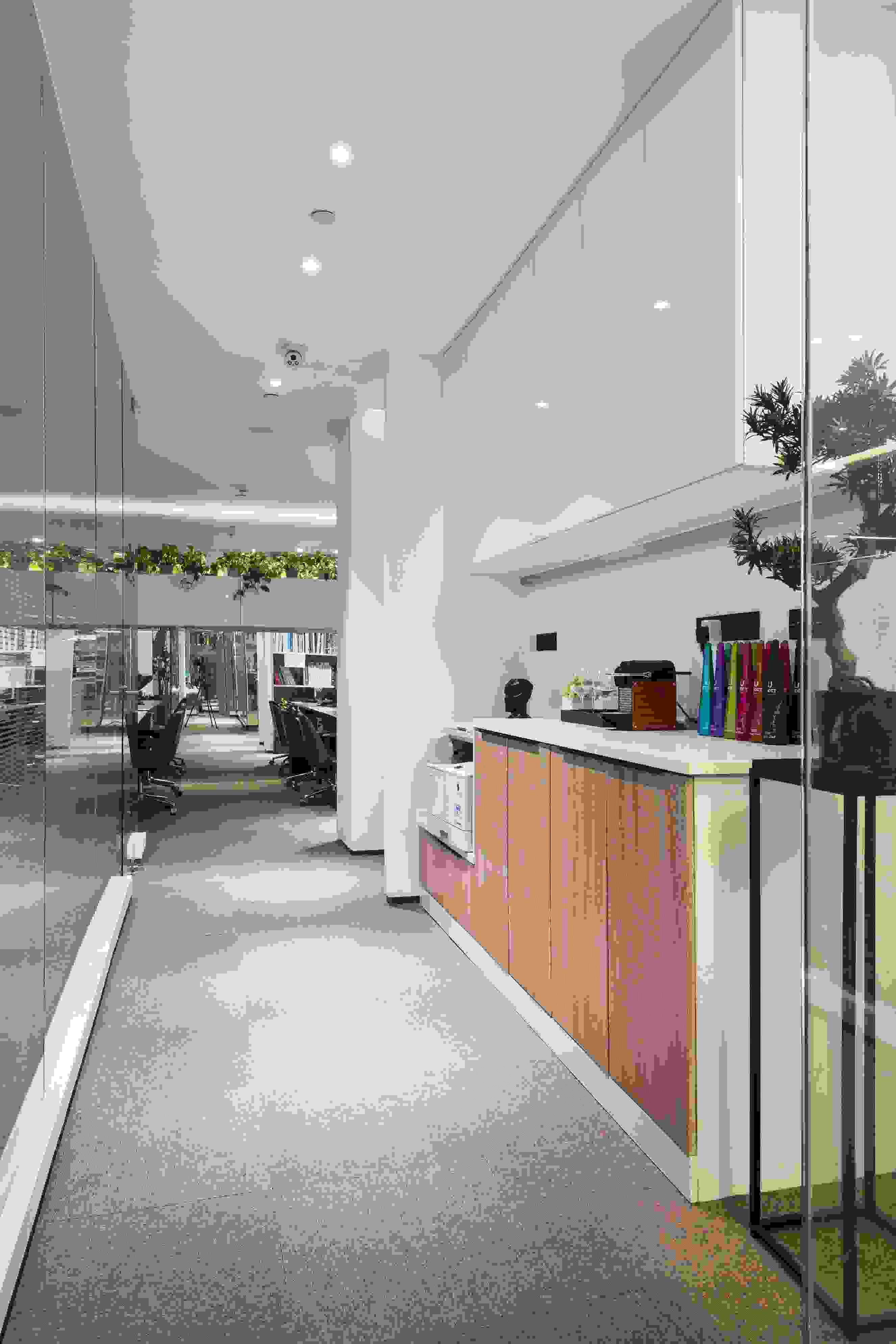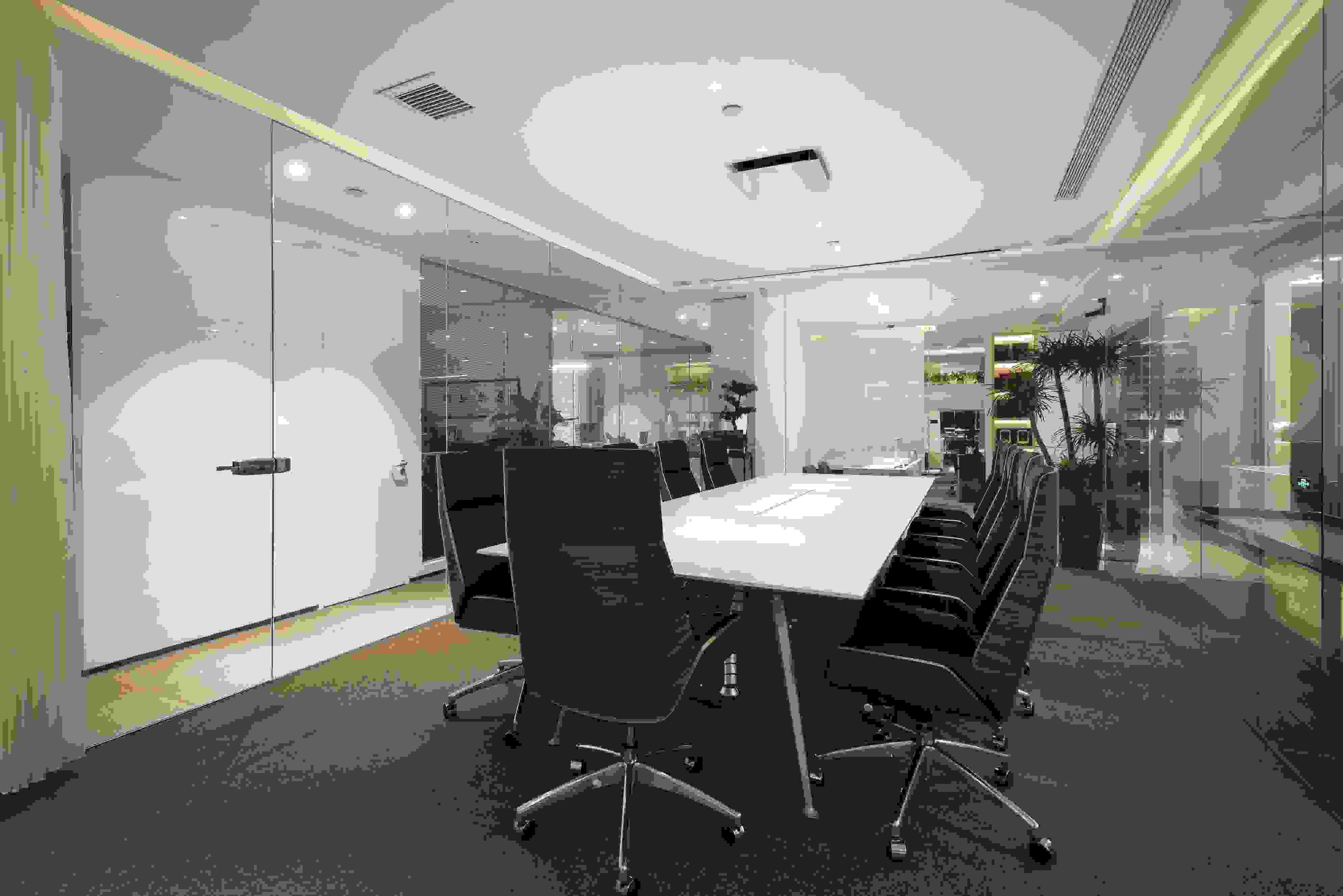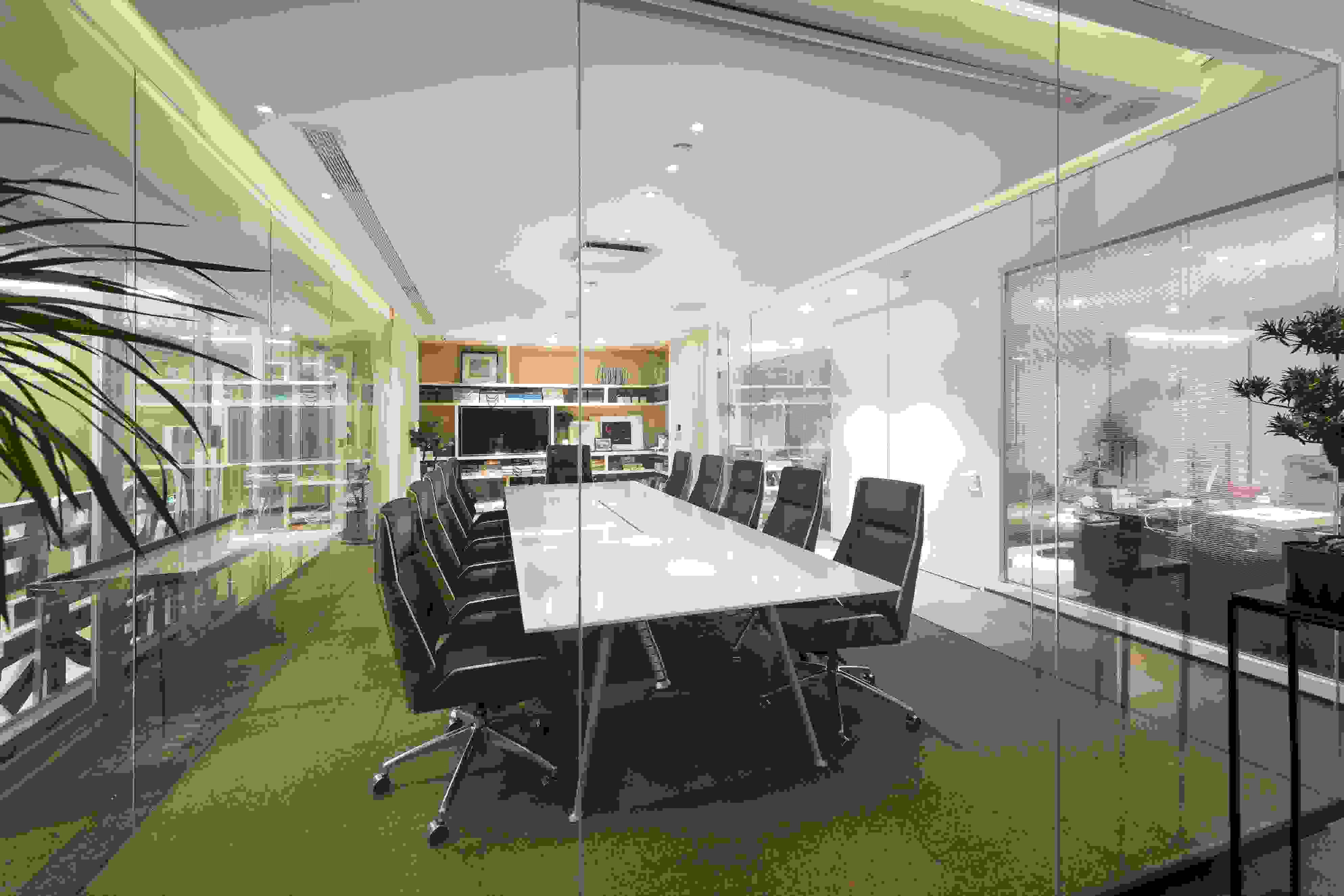 會議室以玻璃盒子為設(shè)計想法,運用二次空間的形式,清楚地展示了空間里人與人之間的互動。