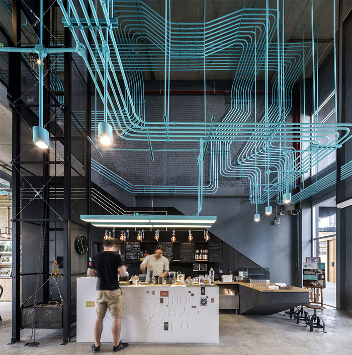 整個(gè) Co-Working Space 面積寬敞,以工業(yè)廠房的形式接待著來訪的客人,稍經(jīng)修飾的地面與裸露的混凝土立柱,帶來*為原始、粗獷的空間魅力,一層為咖啡廳,從售賣各種食品的吧臺(tái)到充滿工業(yè)感的桌椅,很難將它與工作空間聯(lián)想到一塊。