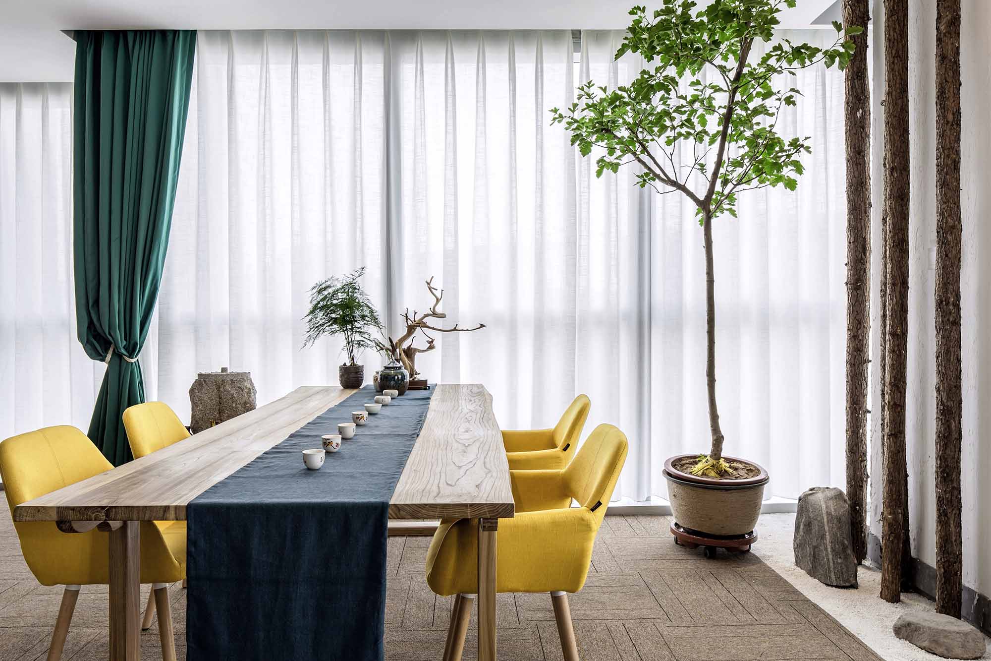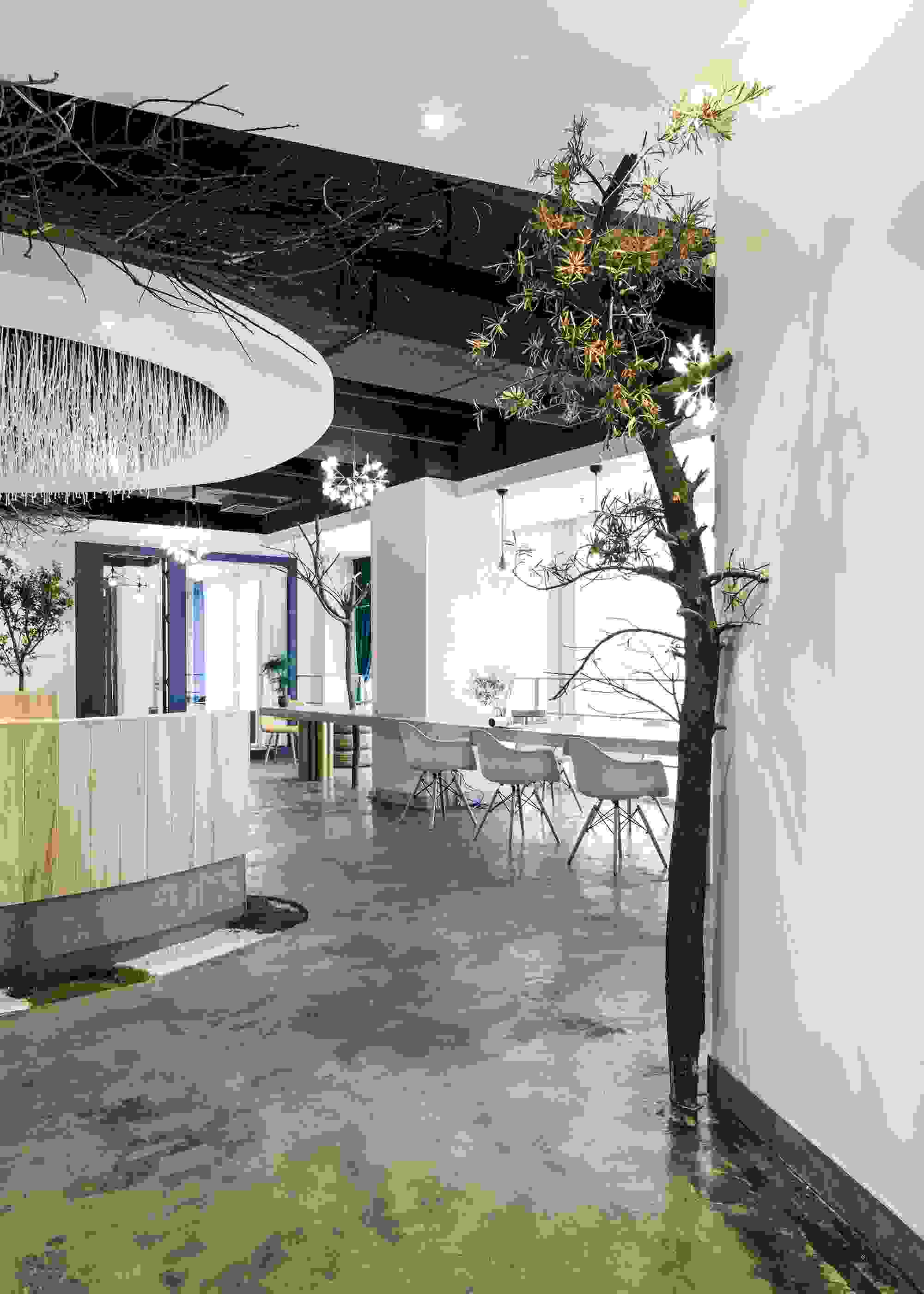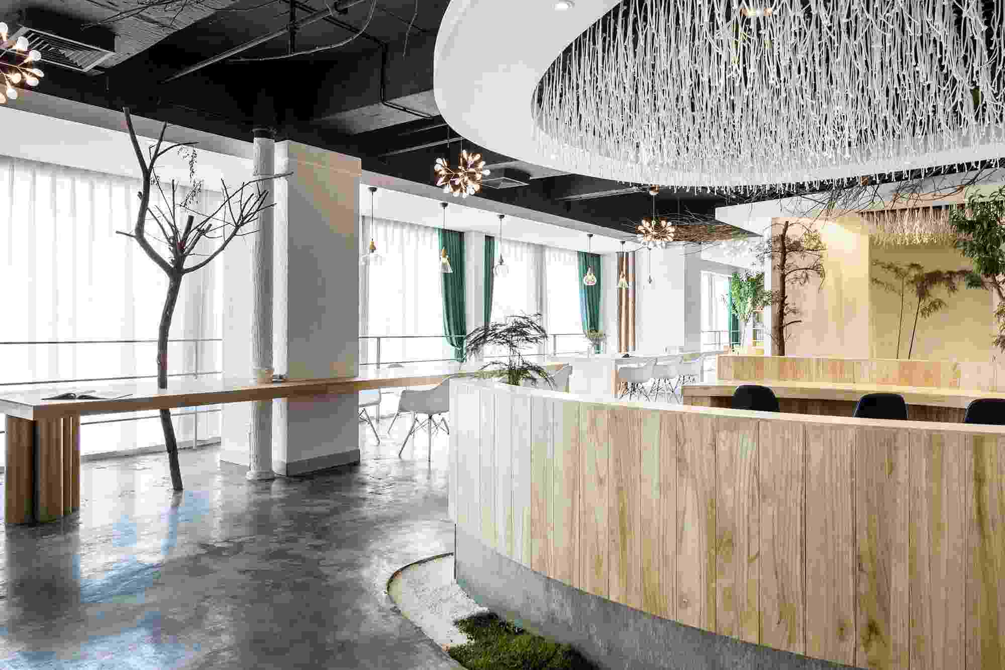 東方的美學向來是含蓄溫婉的,LOGO墻處的玻璃透景配合自然的竹石,隨著太陽的變化,光影也在不斷的變化,猶如人生。在材料的運用上選用的都是一些環保低碳的天然材料,如樹枝、石竹、枯木、天然原木板,地面則是采用了水泥自流平的方式。