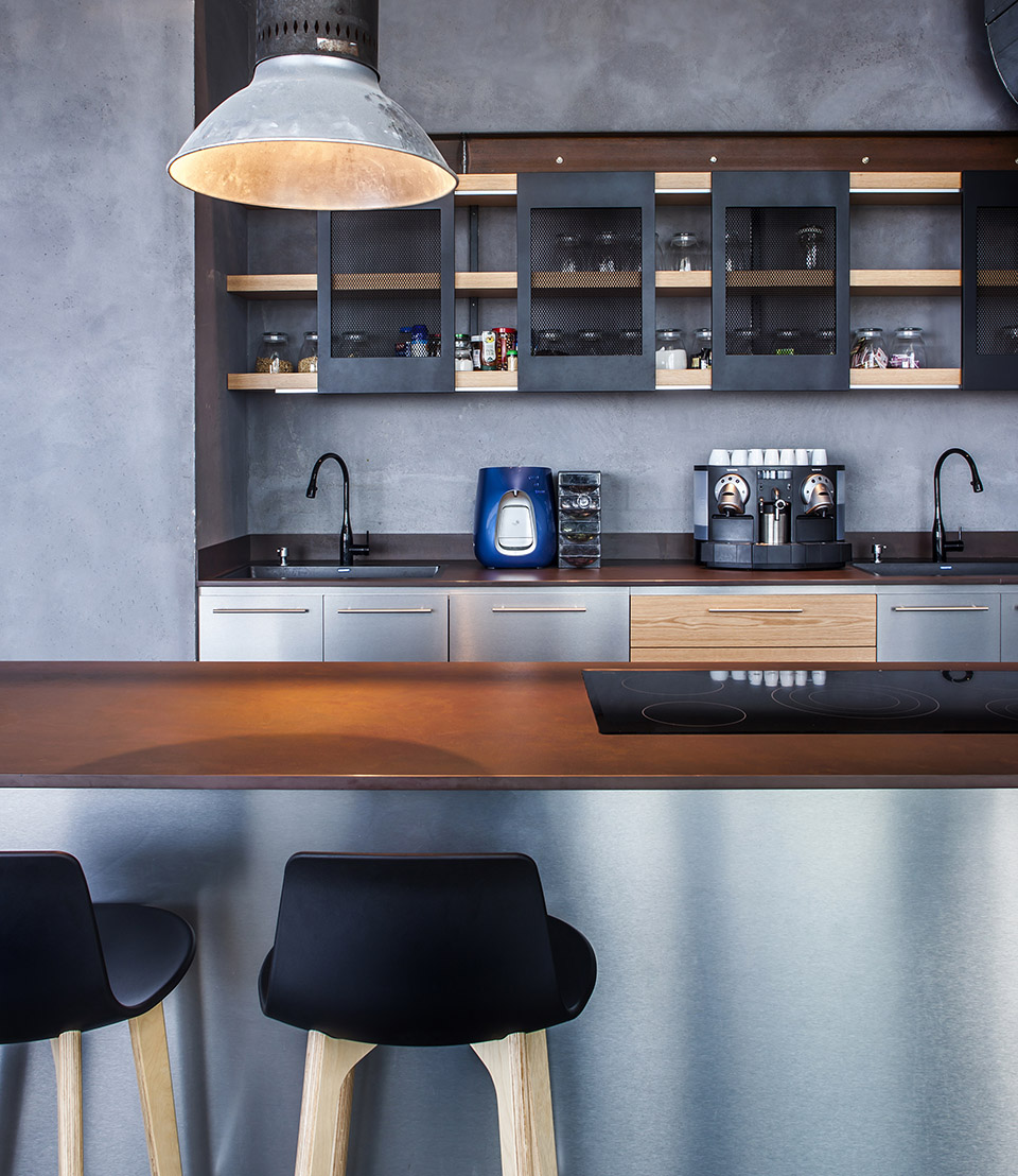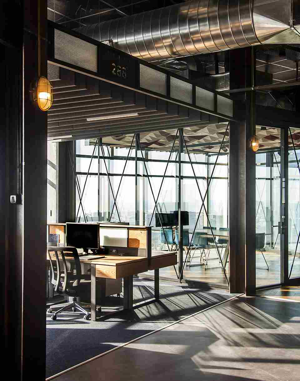 粗糙的原木、不加修飾的混凝土核心筒墻體以及銹色的金屬結(jié)構(gòu)凸顯了這個(gè)辦公空間的工業(yè)氣息。“巧妙地設(shè)計(jì)讓位于城市中心的辦公空間能夠與公司所有數(shù)據(jù)的來源 – 船只發(fā)生了聯(lián)系。我們有意避免了讓人能夠聯(lián)想起豪華游艇的任何元素,而是渲染出一種如同工業(yè)港口般的粗糙氛圍。”事務(wù)所創(chuàng)始人Roy David解釋道。