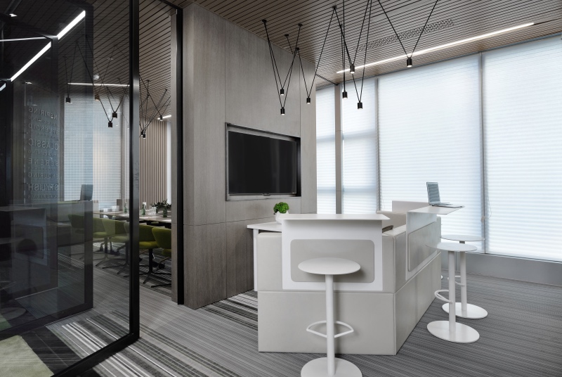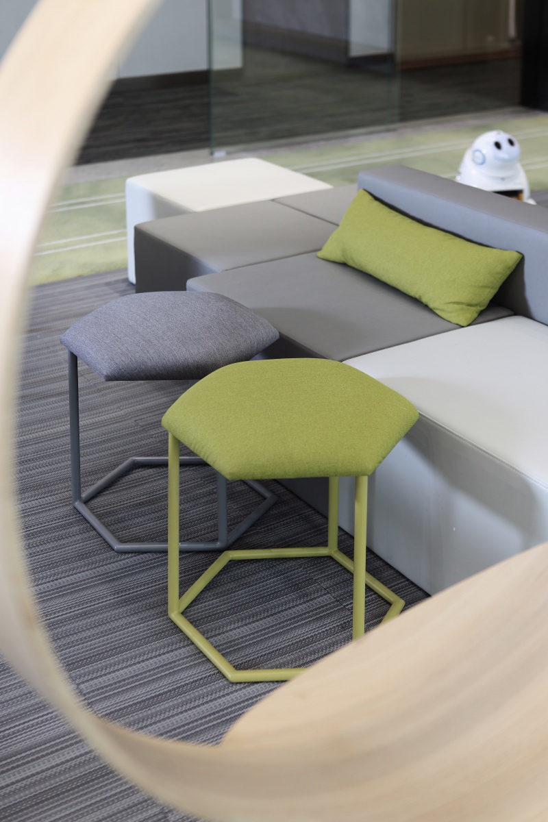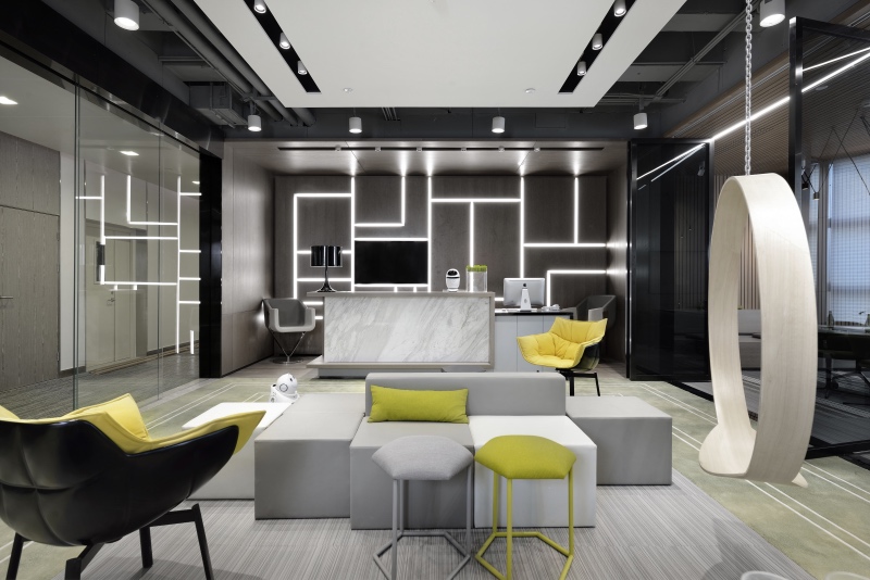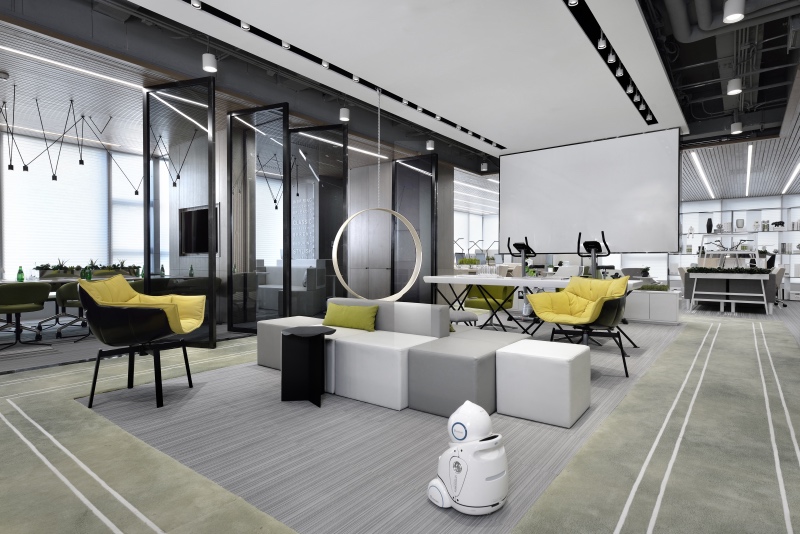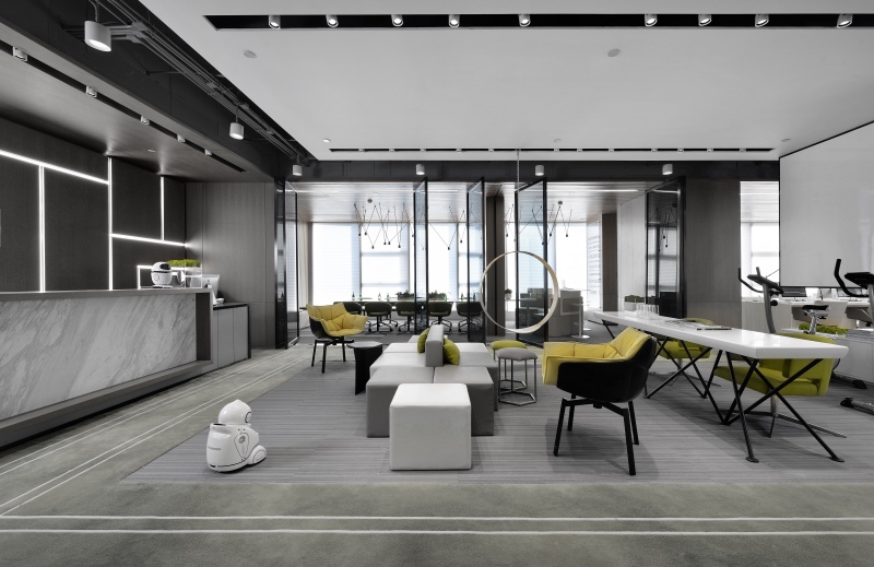 門廳區域摒棄傳統冷冰冰的接待形式,由超級吧臺、茶歇區、健康辦公區、討論區等功能組合而成,把互聯網開放性思維植入到日常辦公生活中。同時利用健康跑道地毯將整個空間串聯起來,讓空間更加具有活力和生氣。