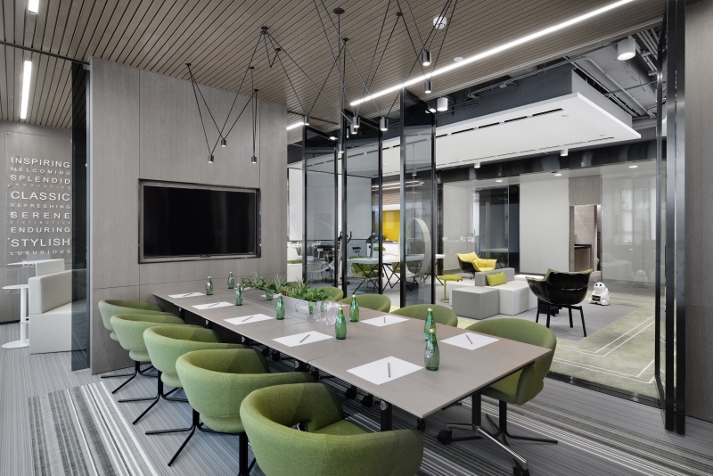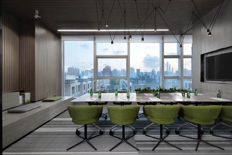 會議空間分為兩個空間,一個是集會議、培訓、活動于一體的多功能會議室,另一個集洽談、路演、討論于一體的創意互動區,僅需開關移門,即可讓空間改變不同的功能屬性,迅速與其他場所互動。
