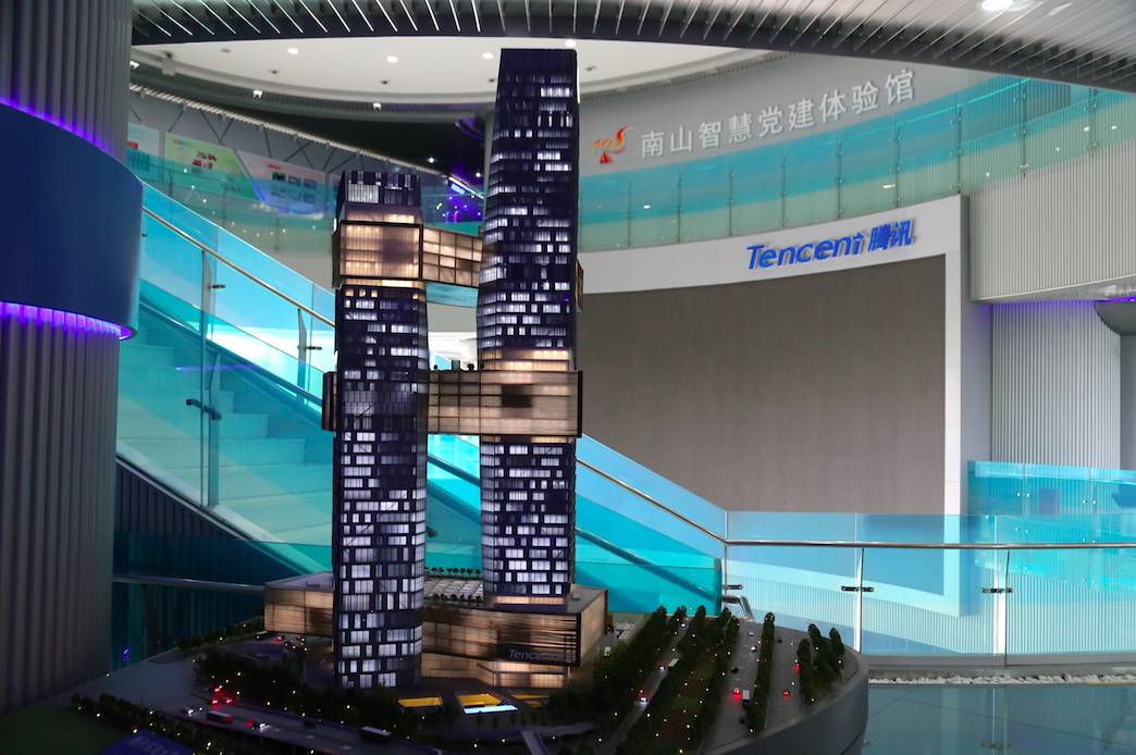 騰訊的新總部大樓是**建筑事務NBBJ的作品。騰訊濱海大廈包括一座248米高50層樓的南塔樓和一座194米高41層樓的北塔樓,由三條「腰帶」連接兩座塔樓,并在內部設置共享配套設施的連接層。大廈的主概念是創造一座互連的塔樓,象征著連接因特網的各個遙遠角落連通,并通過有形的建筑物,更有效得把騰訊員工聯系在一起。