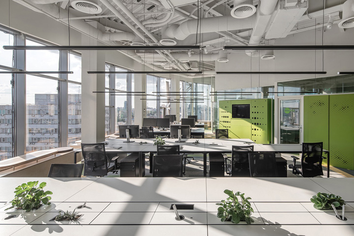 3、混搭風格辦公室設計:原始的混凝土柱和墻壁,以及磚飾面營造出工業外觀。木質元素,大理石細節和經典的簡約家具則增添了許多優雅。線性照明和聲學結構在開放的白色天花板下動態布置,營造出現代寬敞的內部空間,激發創造性工作。