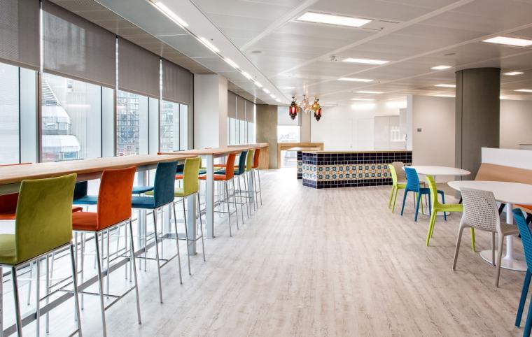 4、國外某報紙出版社辦公室裝修設計要求現代,新潮。開放式的空間和透明的玻璃使室內都變得通透起來,幾何或數字的涂鴉,充滿個性又兼具激勵員工,藍色和橙色的漸變十分的搶眼!