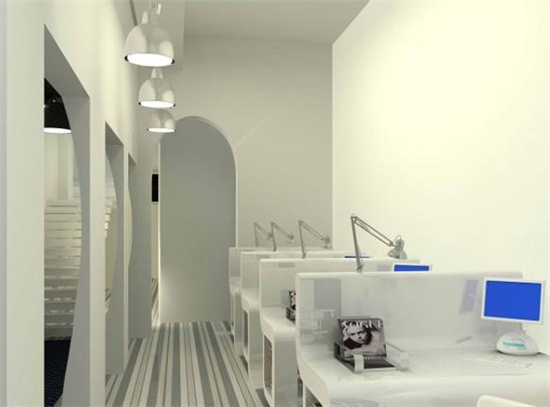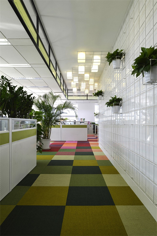 2000平方辦公室裝潢以彩色玻璃隔斷的顏色分出四個會議區域,紅黃藍綠。每個區域中的顏色又都有十幾種微妙的變化,共計54種彩色玻璃的顏色,在環形走廊上完成色彩的循環。在墻面上,設計師用白色瓷磚做辦公空間內環形走道的墻面。利用材料的反射性能,彩色光暈在空間中能流動起來。像水彩在紙上洇開一樣,形成氤氳彌漫的效果。同時,考慮到辦公空間的進深較大,白色瓷磚能夠反射外部光線,增加室內空間的光亮度。