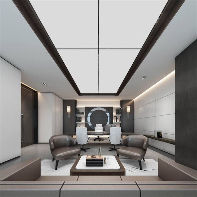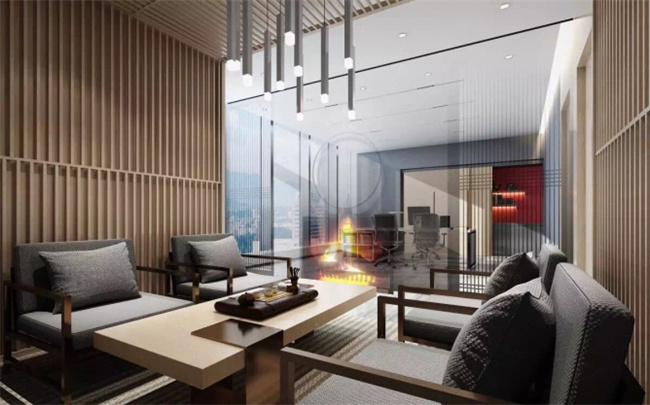 3、集團(tuán)總裁、總經(jīng)理等領(lǐng)導(dǎo)辦公室裝修設(shè)計(jì)直接代表著企業(yè)的形象和實(shí)力。案例中展示的總裁辦公室為新中式風(fēng)格,總裁辦公室既有辦公區(qū)也有接待區(qū),方便了總裁接待客戶。新中式風(fēng)格既凸顯了總裁的儒雅,也體現(xiàn)了企業(yè)務(wù)實(shí)、內(nèi)斂的特性。