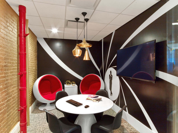 廣告公司辦公室會客區設計:裸露管道被刷成紅色,同時還設計了窩型的坐椅,很有創意感,墻壁上手繪了黑白線條的裝飾畫,空間布置得很有藝術范兒氣息。公司的VIP會客室設計了玻璃門可以保持大空間的通透感,室內的墻壁和天花板都設計成紫色調的,帶來奢華神秘的視覺感,墻壁上掛著裝飾畫,為空間營造出藝術風氣息。