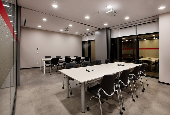 2、其次在上海辦公室設計時,會議室常常被傳統的分割成單獨房間,然而有時候因為公司的人數原因無法進行統一的大會,但若是規劃了大型會議室就又會導致會議室數量減少從而使用不便。針對于這種情況在辦公室裝修時規劃出一個大會議室,然后使用活動隔斷將其分開,當需要多人統一開會時便可以將活動隔斷打開增加會議室面積。這樣不僅節省空間也能使空間更為靈活。